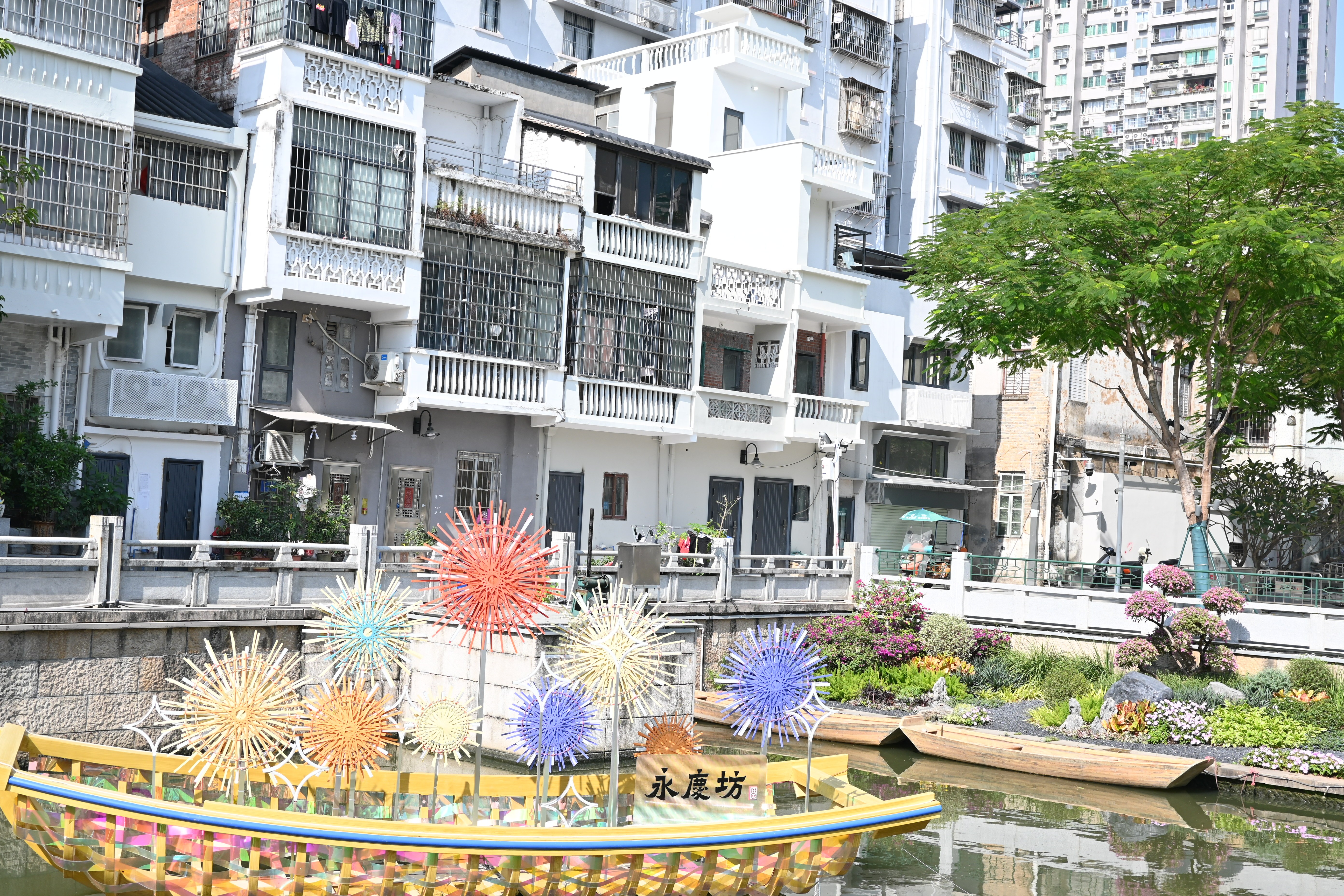 历史文化街区保护活化是荔湾区践行内涵式发展的前沿探索。在尊重“一街一特色”的原则下,为不同内核的街区注入独特内涵。在永庆坊的滨水地块,缤纷的现代花艇装置停靠在荔枝湾涌上,与周边传统花艇形成老城市新活力的鲜明对照,年轻人聚集在涌边合影,留存下这既岭南又时尚的画框。