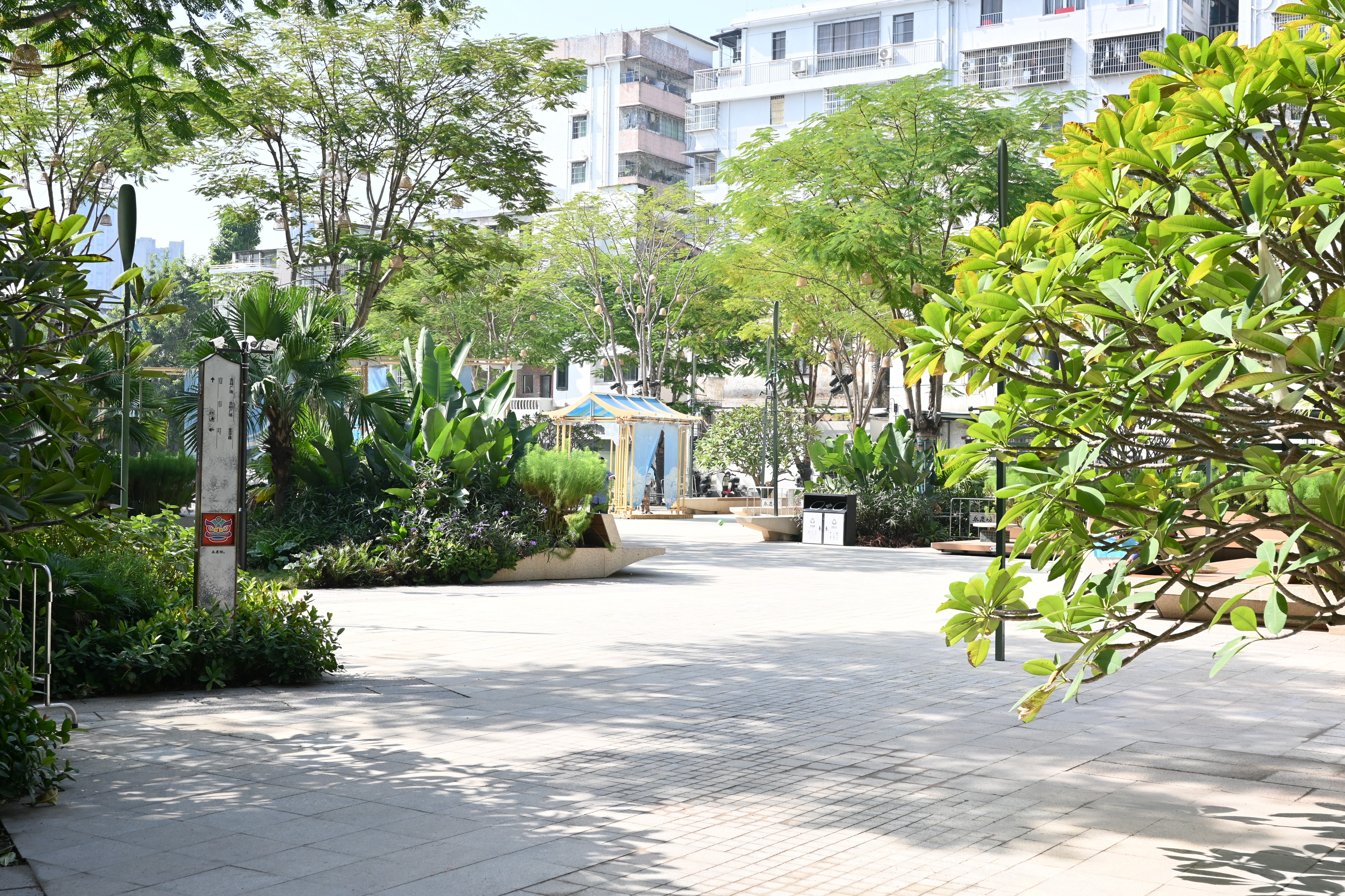 一排排新粉饰的灰色砖墙,全新的窗框,在绿树成荫中掩映着,历史的厚重感扑面而来。通过一番修缮,荔湾区历史文化街区不再破败,但风貌依旧。耀华大街历史文化街区的大笪地,楼前楼后补种植物,在狭小的空间中见缝插绿,将杂乱的停车场和杂物堆,整理成地铁出口旁的公共休闲空间。